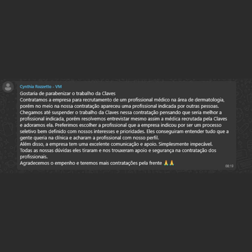 A ClavesHealth é a Plataforma de Recrutamento Especializada na Saúde, conectando você a profissionais qualificados, como dentistas e outros colaboradores que fazem uma clínica odontológica funcionar. Nossa equipe facilita a busca pelo candidato ideal, eliminando a burocracia e em parceria com a Board Academy, elevamos o grau de maturidade das clínicas no Brasil, levando gestão e governança de alta qualidade para as empresas, garantindo que você contrate com segurança e confiança.